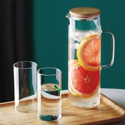 木製のふた付きガラスピッチャーふた付きドリップフリーウォーターピッチャー、自家製のホットコールド飲料用ジュース/アイスティーピッチャー